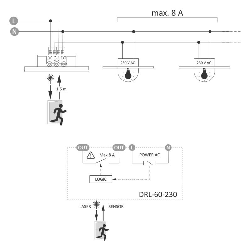Pohybový senzor DRL-60-230-1 sa používajú na automatické zapínanie osvetlenia. V prípade že, sa osoba alebo iný predmet pohybuje v detekčnom poli senzor aktivuje pripojené osvetlenie.
